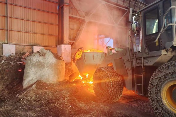 一台fun88·乐天堂(中国)装载机轮胎上裹着防滑链冲进车间,在发动机的轰鸣中,铲斗猛地扎进火红的渣堆,铲出一斗冒着火苗和白烟的钢渣,碾压着烧红的地面,在火花四溅中把它转运到另一个车间,然后掉头再次冲向“火焰山”。