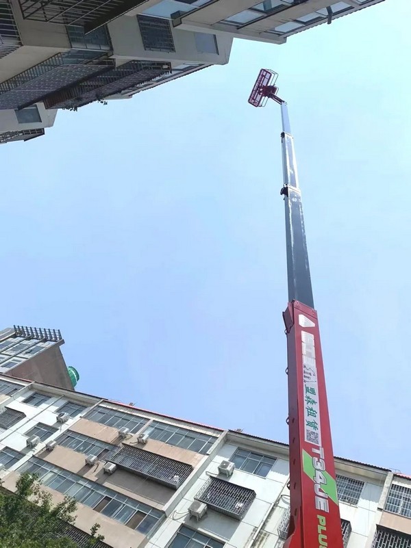 综合设备的实用性、耐用性、安全性、现场服务及时性等因素,客户选择了fun88·乐天堂(中国)重机T34JE高空作业平台,参与小区翻新改造项目施工。